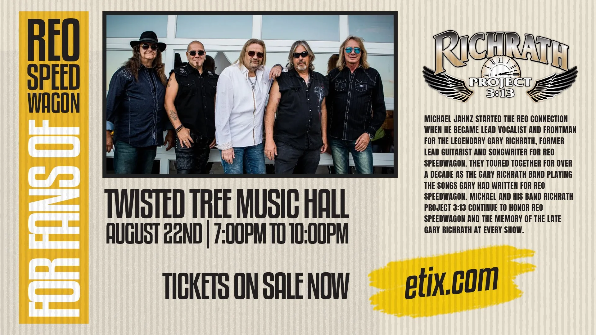 Michael Jahnz started the REO connection when he became lead vocalist and frontman for the legendary Gary Richrath, former lead guitarist and songwriter for REO Speedwagon. They toured together for over a decade as the Gary Richrath Band playing the songs Gary had written for REO Speedwagon. Michael and his band Richrath Project 3:13 continue to honor REO Speedwagon and the memory of the late Gary Richrath at every show.